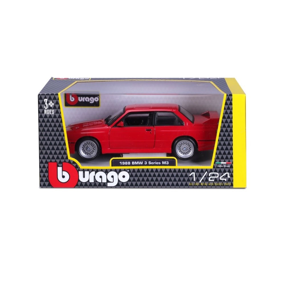 This BMW 3 Series M3 (1988) diecast model car is red and features working wheels and opening doors. It is made by Bburago and is 1:24 scale (approx. 18cm / 7.1in long).