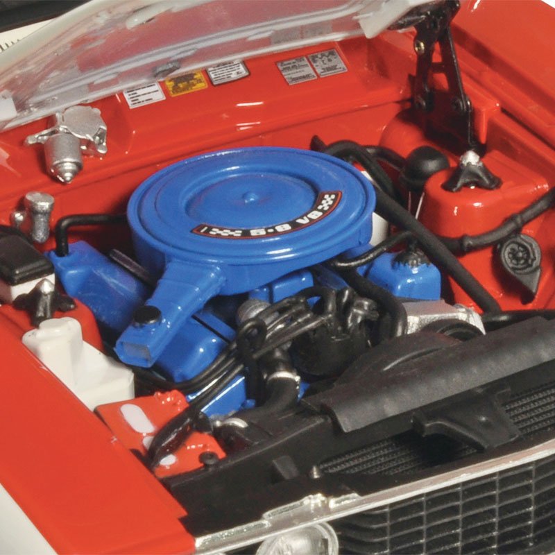 • Raising the bonnet with the etch metal hinges, displays the highly detailed Cleveland 5.8L (351ci) V8.