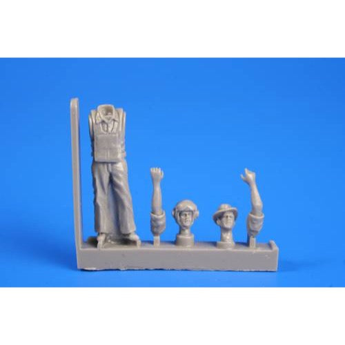 Wonderfully detailed figure of an RAAF Pilot wearing trousers and short-sleeved shirt beneath a Mae-West. The set comes with a decal sheet offering two badges that can be applied onto the life jacket. The set offers also another head with a helmet and goggles or with a distinctive Aussie style headgear.