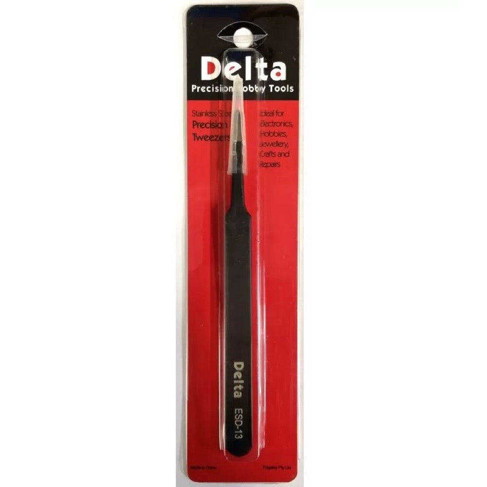 These high quality blunt tweezers are perfect for handling decals and other small parts. The blunt end allows for precision handling and placement of decals. Made from stainless steel, these tweezers are a genuine Delta product.