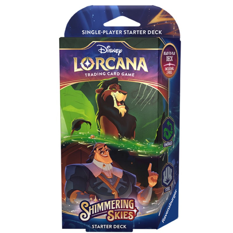 Two starter decks are available for the Disney Lorcana TCG set Shimmering Skies. Each prebuilt deck has 60 cards and features cards from two inks, each with distinct play styles. The two ink combinations are Amethyst & Ruby and Emerald & Steel. Each starter deck also includes a booster pack of 12 cards to start your collection.