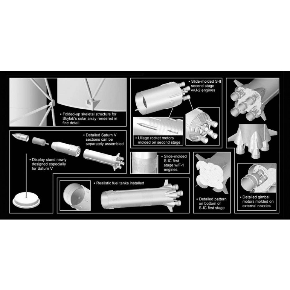 Owners of Dragon's Saturn V rocket will cause jaws to drop, while the finished model will without fail draw gasps of astonishment from onlookers! This is the second monstrous 1/72 scale kit of this rocket type and it comes with brand new toolings. The most obvious difference is the upper stage, which employed an S-IVB stage from a Saturn IB rocket. What's especially significant about that this part is that half of it is made of transparent plastic to allow viewers to see Skylab nestled neatly inside. All relevant details are carefully reproduced on the two rocket stages and Skylab, and the model comes with accurate and large decals to provide relevant markings. This Saturn V kit will be a centerpiece of any space fan's collection, and as such it comes with a stable circular base to allow it to stand stably on the floor.