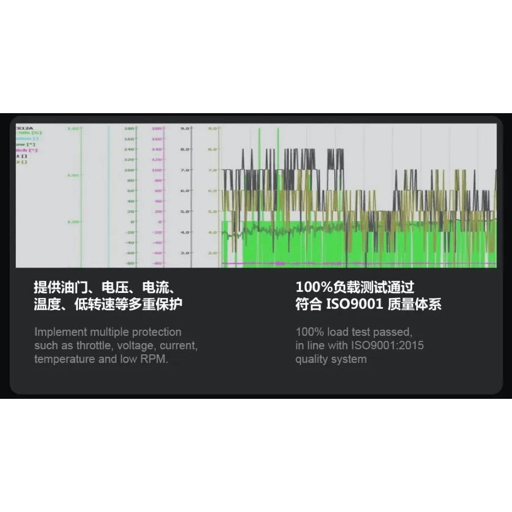 • Multiple protection measures are implemented, throttle, voltage, current, temperature, and low RPM