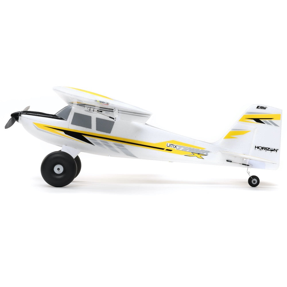 Convenient, capable, and affordable, the E-flite® UMX™ Timber® X combines the fly-almost-anywhere advantages of the UMX Turbo Timber with the unique capabilities of the larger Timber X 1.2m. Compared to the ultra-micro Timber models that came before it, its brushless power system features a 3S-compatible outrunner motor and the wing has a shortened span, larger ailerons plus an enlarged elevator and rudder. On low rates, the controls can be smooth and docile. On high rates, they deliver eXtreme 3D capability — to fly as mild or as wild as you'd like! The full-span ailerons can also be used as flaperons for improved slow flight and STOL performance. Spektrum™ AS3X® and optional-use SAFE® Select technologies are included for easier flying, and the control unit/flight controller provides real-time flight battery voltage telemetry and other data to compatible Spektrum AirWare™ equipped transmitters. Oversized, tundra-style wheels soak up bumps and offer excellent prop clearance. Fly from grass, gravel paths, dirt trails, paved, and other surfaces, outdoors in yards, parks, sports fields and beyond, or indoors in suitable spaces including gymnasiums. Install optional floats (EFLUA1190, sold separately) to add large pools, small ponds, and lakes to your flying site options. Included LED landing, navigation and simulated strobe lights make it possible to fly from earlier to even later in the day. Constructed of advanced EPS material for a lightweight but durable airframe, the UMX Timber X arrives 100% factory-assembled and ready to bind to your 5+ channel DSMX®/DSM2® equipped transmitter. That means you can be flying within minutes of opening the box!