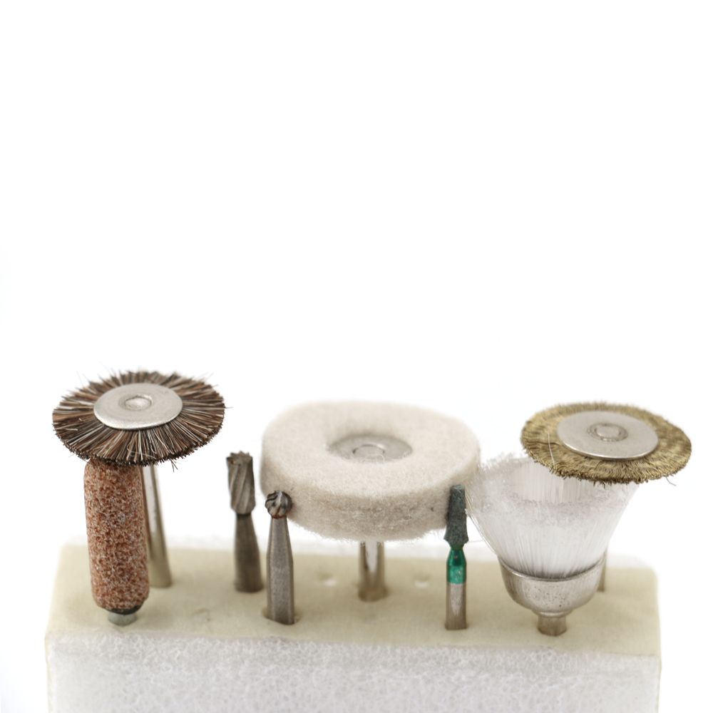 All rotary tool accessories have either a 3/32" & 1/8" shanks and can be used with Dremel, Craftsman, Alcraft and most other Rotary Tools. Includes bristle brush, wire brush, felt wheel, grinding stones & burrs.