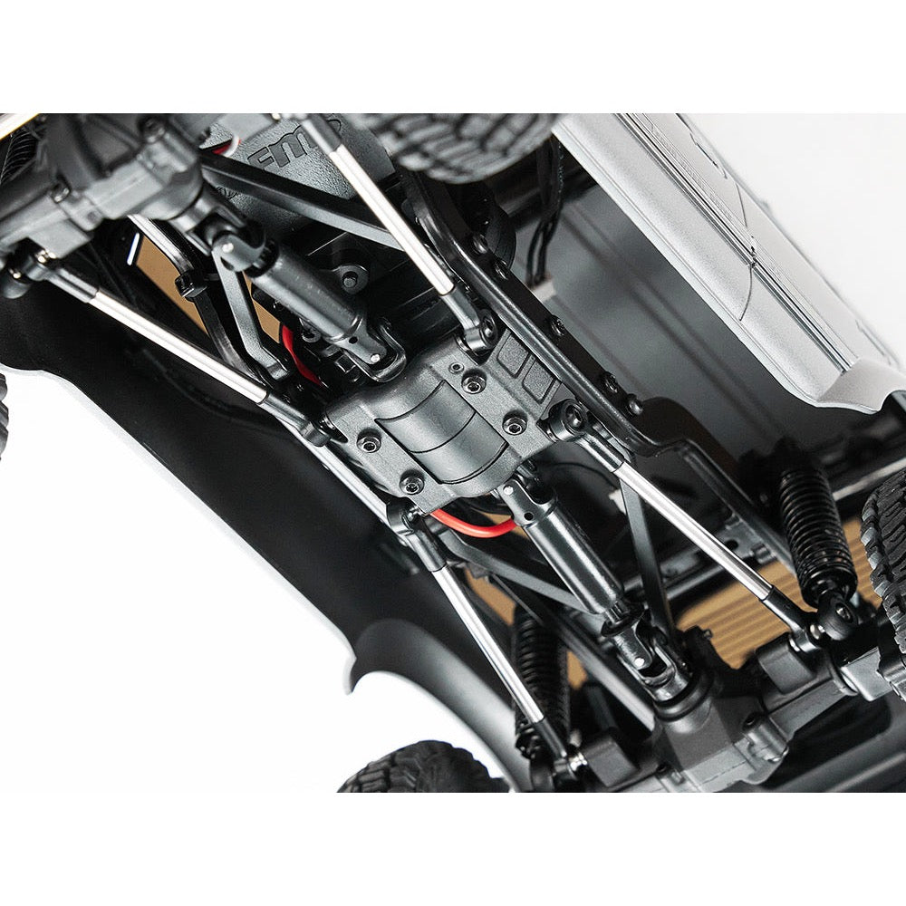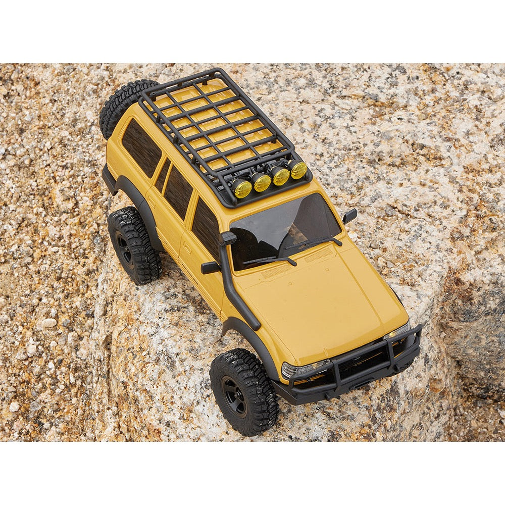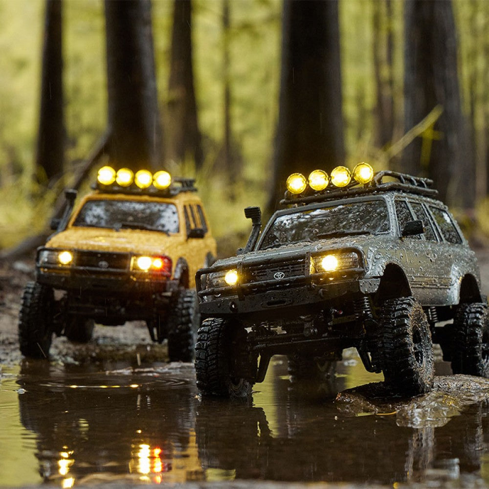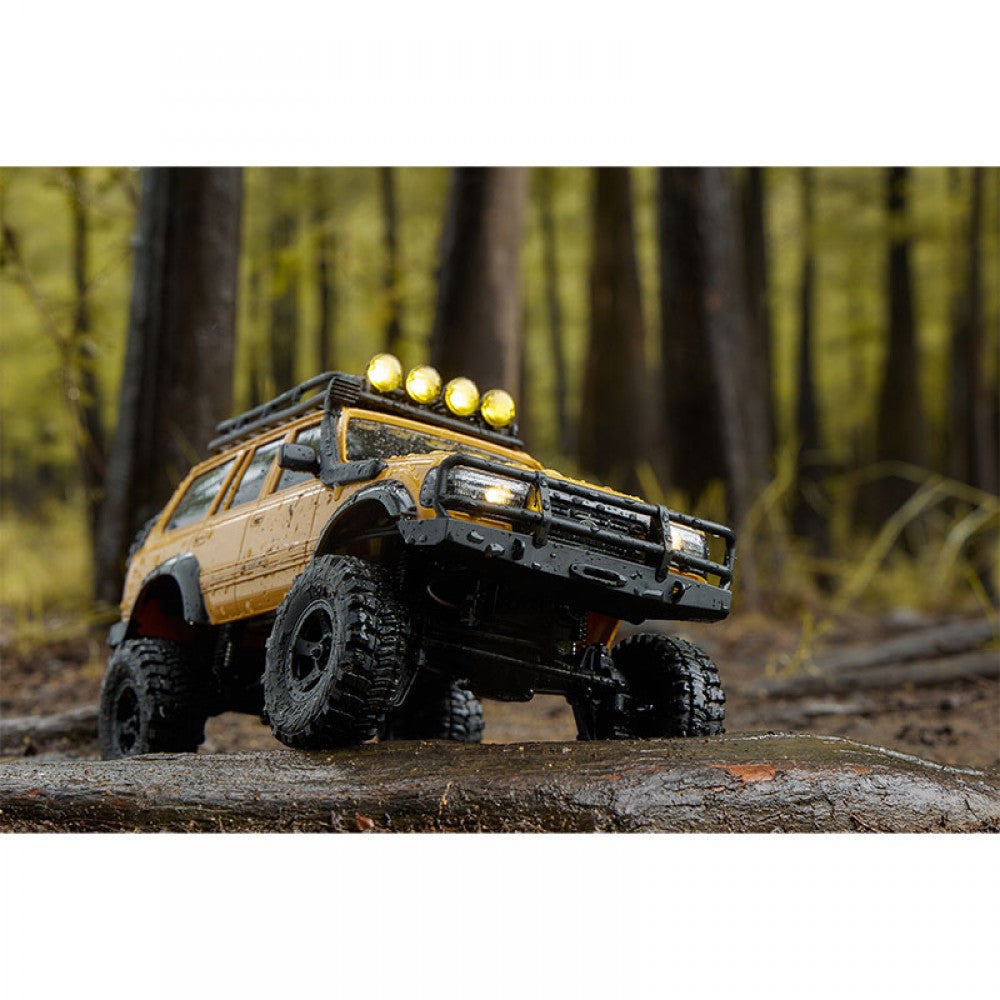 This is FMS 1/18 Toyota LC80 RS Yellow Version 4WD RTR EP w/ 2.4GHz Radio. With steering-linked lights, sleek-looking car body, and delicate vents, FMS 1/18 Toyota Land Cruiser 80 is designed to match static-model standards. Even the interior is carefully recreated in 1:18 scale. A feature-packed trail-proven chassis drives the vehicle, aluminum rails providing a rigid platform; meanwhile, a multilink geometry with panhard bar chassis design allows for top axle articulation. Power is delivered from the super high-torque gearbox to ultra grippy beadlock tires via nylon driveshafts. Land Cruiser 80 features water-resistant electronics: an independent servo, 2-in-1 receiver/ESC, 050 motor and 7.4V 600mAh battery, which allows for strong power and all-weather operations. FMS 1/18 Toyota Land Cruiser 80, an entertaining and desirable solution for RC crawler.