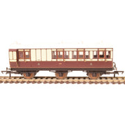 This LNWR coach is modelled as having step boards to enable access at stations with low platforms and oil lamp lighting.