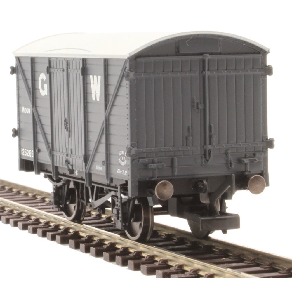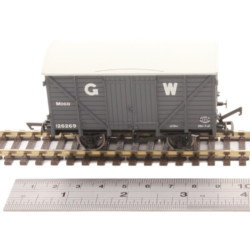 Mogo' vans were railway vans built by Great Western Railway (GWR) in-order to transport motor vehicles. Each van could only take a single vehicle which was loaded by driving through doors in the end of the van. The van additionally featured side doors so that it could be used to transport normal goods if not needed as a motor transporter. 350 wagons were built by GWR with the first appearing in 1933.