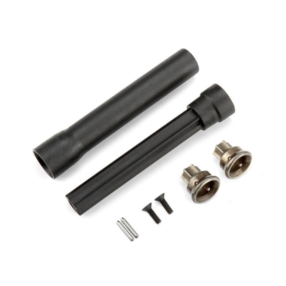 This Center Drive Shaft Set features a universal joint at either end, with a telescopic shaft that slides to allow the suspension to compress.