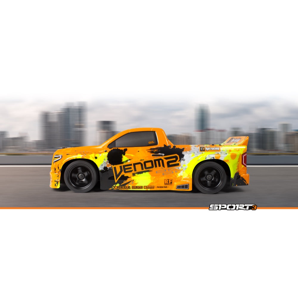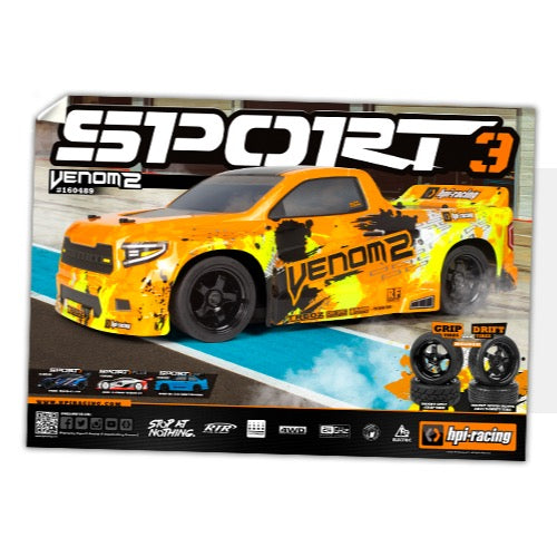Is it a race truck, or a drift truck? HPI has the answer, "Both!" The Sport 3 Venom 2 1/10 Ready-to-Run (RTR) 4WD Brushed Electric Truck by HPI is a high-performance RC vehicle designed for for a versatile and stylish ride. With an updated Venom T-10 bodyshell, this model showcases a modern street truck aesthetic with striking graphics. Built on the robust Sport 3 chassis, it offers a sealed ball-bearing-supported drivetrain for low maintenance and high efficiency. This RTR includes two full sets of pre-mounted tires and wheels, allowing you to choose from sideways drift action or street racing fun. Whether you're into drifting or street racing, the Sport 3 Venom 2 provides an adaptable platform that can handle a variety of driving styles and conditions.
