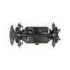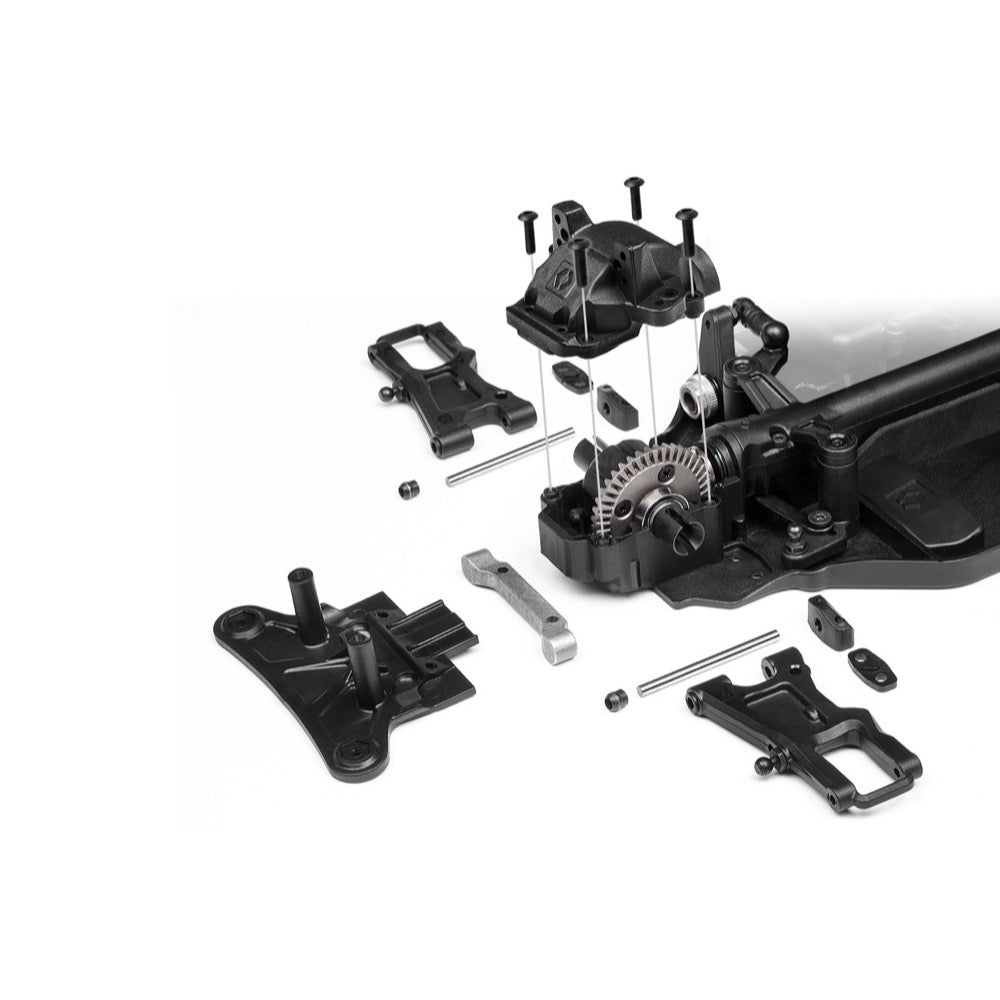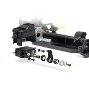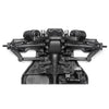Bevel gear differentials at each end of the car transfer power from the driveshaft to the dogbones and axles that drive each wheel. The all-metal construction allows the drivetrain to withstand powerful brushless motors for easy upgrading in the future. Rubber-sealed ball bearings support the differentials and each diff can be tuned independently by changing the diff grease.