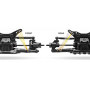 The performance tested adjustable double bell crank system provides optimum steering precision at all speeds. A metal drag link plate connects the cranks for extra durability, the additional drag link mounting positions also allows for Ackermann angle adjustments.