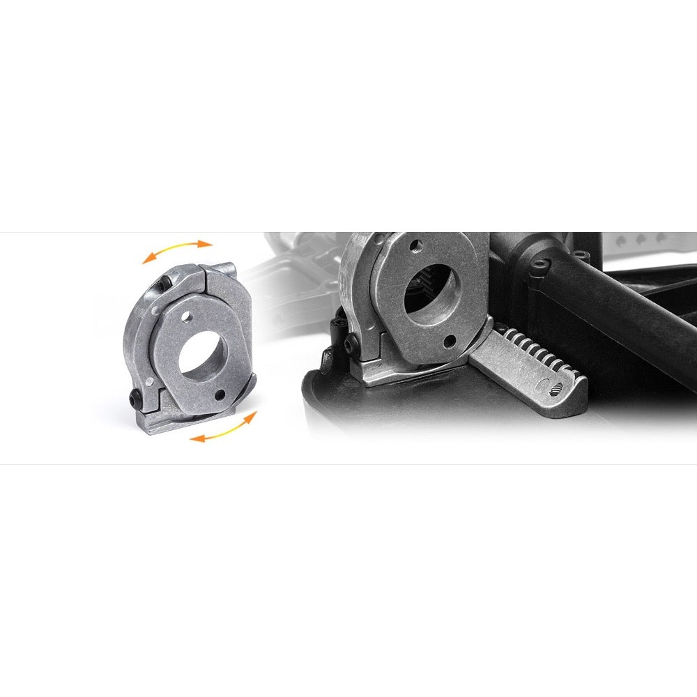 The cast aluminum cam-style motor mount holds the motor in place for a secure pinion/spur connection. Two screws hold the cam firmly in position on the mount, and cooling fins on the lateral support aid heat dissipation to keep the motor running as efficiently as possible.