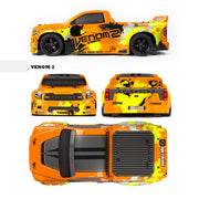 The Venom 2 features a revised T-10 bodyshell, reflecting the greatest trends in street truck aesthetics. The bodyshell is crafted from durable clear polycarbonate, offering both high tensile strength and flexibility. This contemporary design includes a large hood and grill, giving it an aggressive stance while the stunning graphics add to the visual appeal. The robust construction ensures durability during intense driving sessions, making it suitable for both novice and experienced drivers.