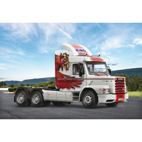 The Scania T143H 6x2 is a strong, reliable truck which is used for hauling heavy loads over long distances. The V8 engine is Europe’s strongest and most reliable truckengine, which makes high speeds possible at a low fuel consumption. The R-type cab with its rounded edges and slanted windscreen has been developed in a windtunnel. It also meets the most stringent safety regulations. Scania trucks are being used in more than 60 countries all over the world, from Lapland to Australia.