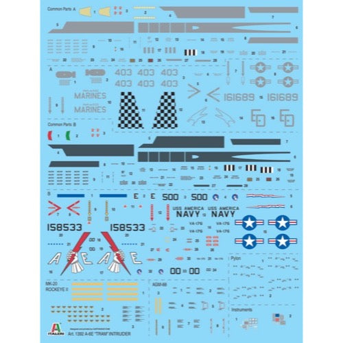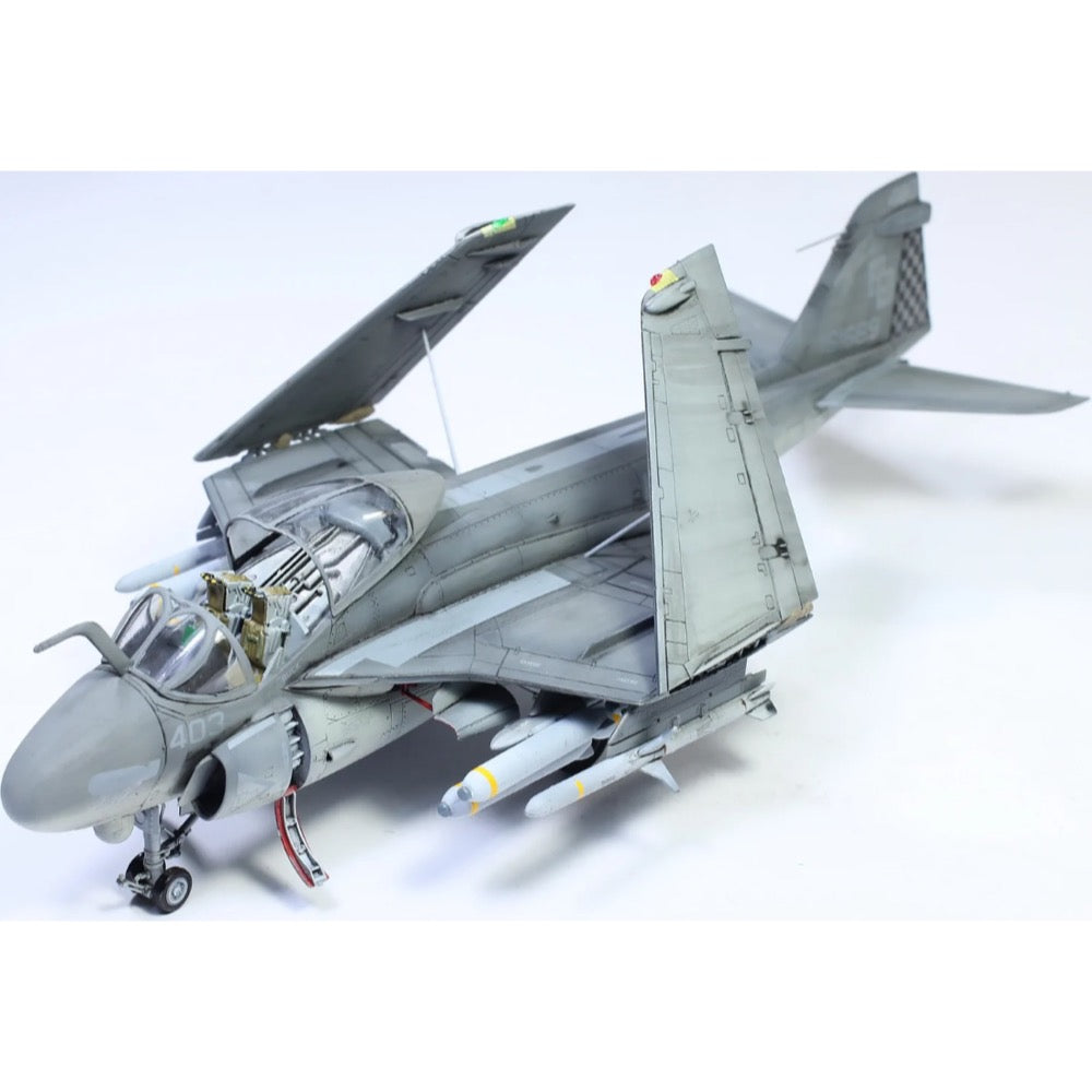 The A-6 Intruder entered service in the mid-60s as ground attack carrier based aircraft to replace the outdated planes as the propeller-driven A-1 Skyraider and the A-3 Skywarrior. The Grumman Corporation developed and designed the A-6A, based on U.S. Navy specifications, a twin jet-engine all-weather medium attack aircraft able to operate from the American aircraft carriers. The so called “Intruder” was characterized by a sturdy and robust fuselage and for the two seats side by side cabin configuration for the pilot and the weapons officer. The A-6E was the definitive attack version of the "Intruder" improved in avionics and attack systems, in particular in the version named TRAM, from the acronym of the laser target designation system, that allowed to be more effective to perform “all weather” missions and to be more lethal in detection and suppression of enemy targets. Thanks to its hardpoints under the wing the A-6E Intruder was able to load an impressive offensive armament as conventional bombs, Paveway laserg-guided bombs, Harpoon anti-ship missiles, HARM anti-radar missiles. It actively participated either from ground bases or from the carriers of the U.S. Navy, to Desert Storm campaign combat missions.