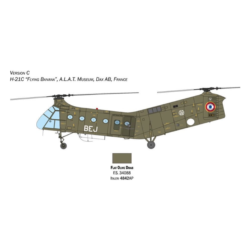 The H-21 Shawnee helicopter is best known for its nickname "the flying banana", which derives from the peculiar upward angle of the aft fuselage. The fuselage, uniquely designed in this novel way, was developed to accommodate the two powerful tandem rotors and the oversized propellers. As a result of the two rotors and the strong aerodynamic structure, the H-21 became an effective and reliable “workhorse”, able to successfully perform the most demanding transport tasks in a multitude of environments. Widely used by the U.S. Army since the early ‘50s, it was also deployed during the Vietnam war to transport troops and tactical supplies from 1961 onwards. The helicopter proved to be robust and reliable, even during ground support missions where the ‘Gunship’ version was armed with cannons under the nose or through the side doors. It was also used by French troops in Algeria, with an MG 151 cannon fitted on the right door and a .30 calibre weapon on the left.