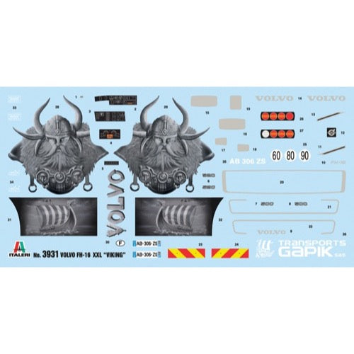 The FH series can be considered a milestone in Volvo industrial vehicle production. Introduced to the market since 2001, it was released in numerous versions and variants. In details, the Volvo FH16 has been the reference version of the Volvo trucks line up. Powered by a 16 liter engine, capable of delivering 610 HP, it was characterized by a good power and low running costs. For those times, Volvo FH16 introduced advanced electronic solutions able to ensure a safer and more comfortable driving even in the long range delivery duties. The FH-16, well-known for its commercial success, has been the basis for many "Show Truck" characterized by impressive and high visibility customized livery. The "Viking" is a good example of Show Truck. The adoption of the bull bar with the grilles to protect the front lights, the installation of additional headlights, the choice of colors and the “Nordic inspired” graphic create a unique truck with a strong personality.