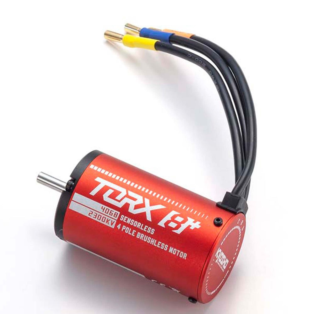 The newly developed 2300 KV KYOSHO SPEED HOUSE TORX8+ brushless motor generates approximately 4400 RPM at 14.8v than the previous TORX8 motor used in the Mad Crusher VE. The red color of the motor distinguishes it as the higher performance of the TORX8+ series.