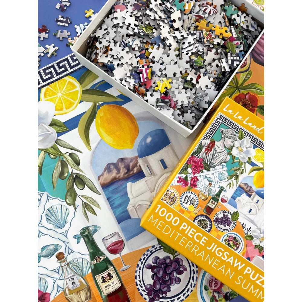 Introducing the Mediterranean Summer Puzzle, a 1000-piece jigsaw puzzle that celebrates the vibrant beauty of the Mediterranean, illustrated by the talented Murilo Manzini for La La Land. Featuring dazzling azure waters from the Aegean coast, delicious Mediterranean cuisines, and iconic greecian motifs. This puzzle is your passport to a European summer!