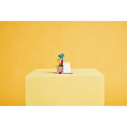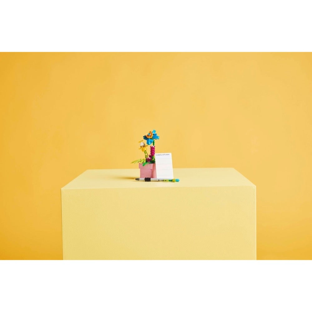LEGO fans have a choice of 3 different flower kits to build: a Typewriter with Flowers toy; a keytar toy instrument on a stand with flowers; or a flowerpot with a pen and notebook. The rebuildable toy playset also comes with 3 stickers featuring thoughtful phrases, which kids can use to decorate the brick-built models.