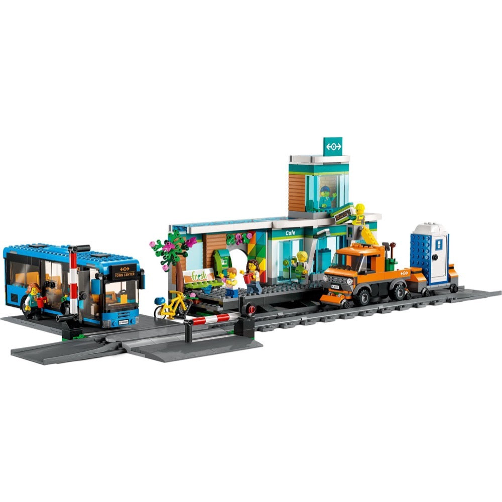 Includes a 2-level train terminal, platform, toy bus, road-and-rail truck, portable toilet, grade crossing and 6 minifigures.