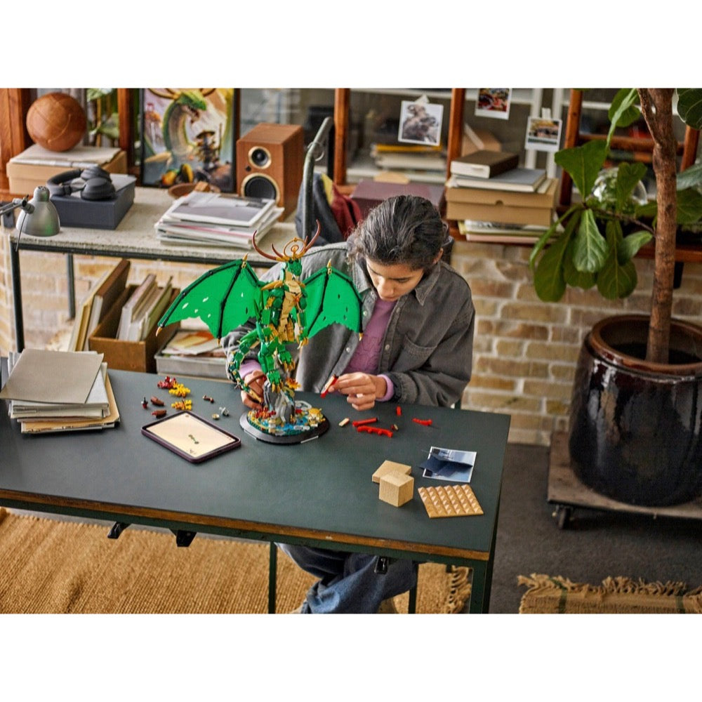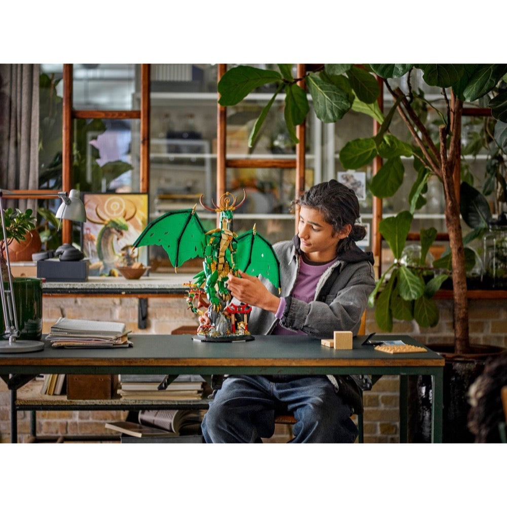 Majestic LEGO® NINJAGO® dragon model on a display stand