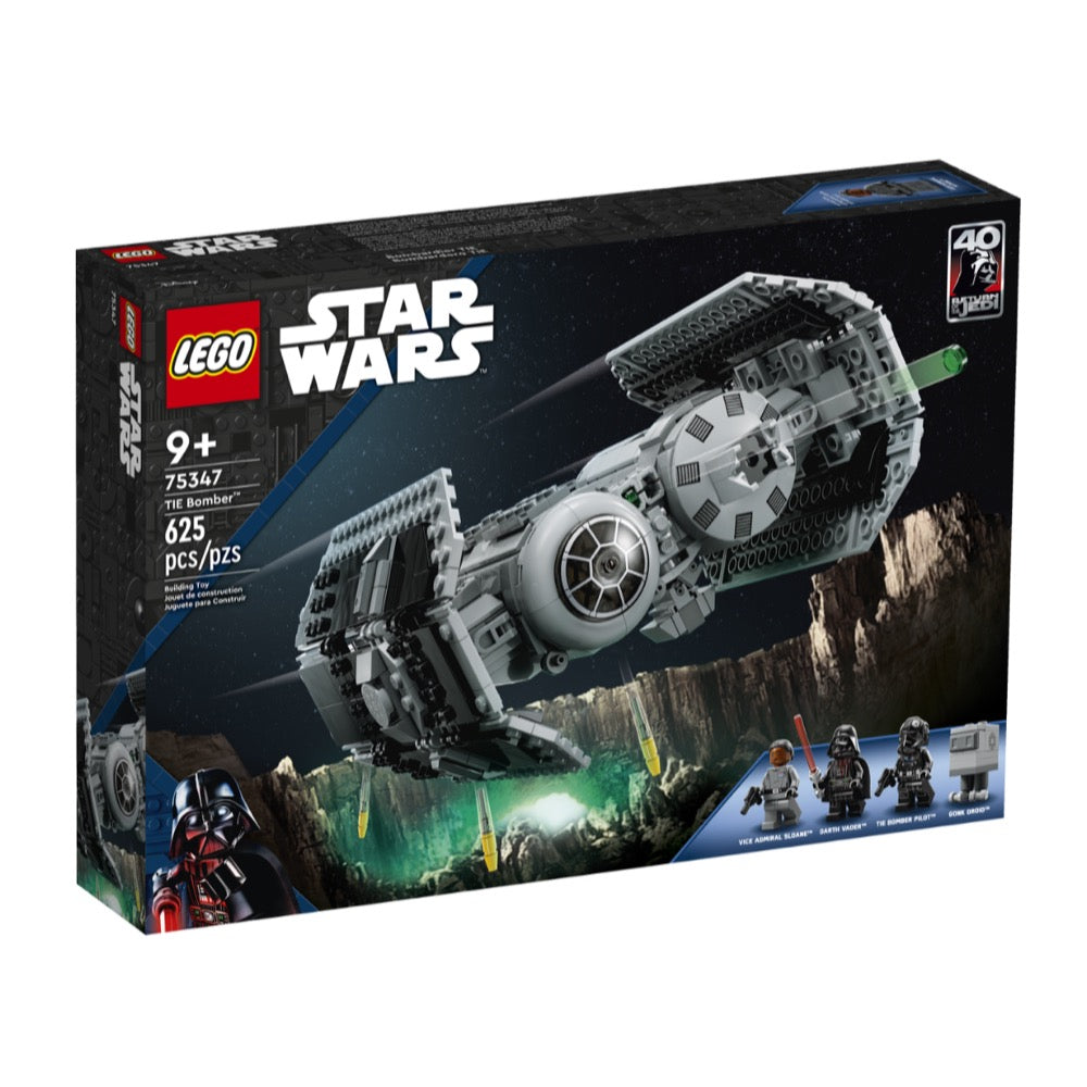 Star Wars: The Empire Strikes Back fans can play out Imperial missions to defeat the Rebel Alliance with this LEGO® brick-built TIE Bomber (75347) starfighter toy. It features an opening minifigure cockpit, a torpedo-dropping function and 2 stud shooters. A top gift idea for Star Wars™ fans aged 9 and up, this action-packed, buildable toy playset also includes Darth Vader, Vice Admiral Sloane and TIE Bomber Pilot LEGO minifigures with weapons, plus a Gonk Droid LEGO figure and a cart to transport torpedoes to the TIE Bomber.