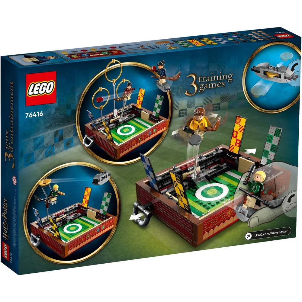 Harry Potter" fans can play Quidditch" with this LEGO® brick toy trunk that unlocks to reveal a Quidditch playing field and customizable minifigures.
