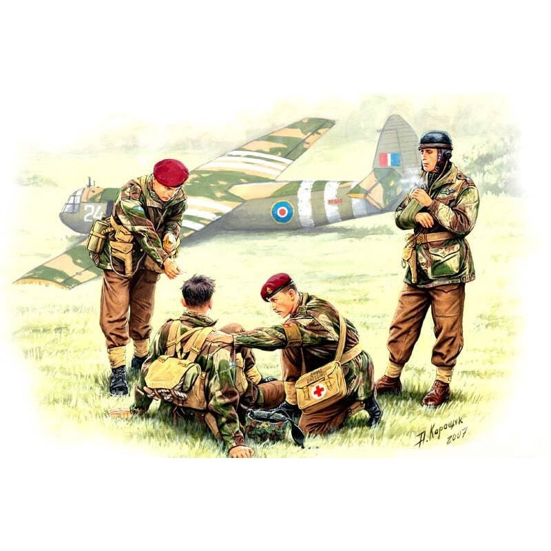 Operation Market Garden began on the 17th of September 1944 with the landing of Allied forces in the Netherlands. This kit represents two British paratroopers helping their comrade who was wounded during the landing, and a British glider pilot standing nearby.
