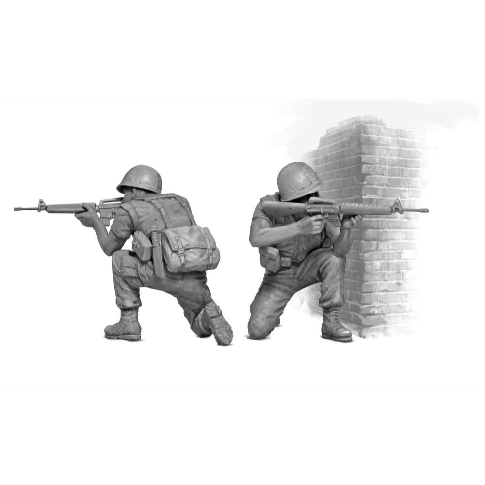 The kit contains a plastic sprue with the parts for assembling 4 U.S. Army soldiers and a figure of their opponent - a North Vietnamese soldier, and an additional sprue with ammunition. American soldiers are fighting: three change positions in a rapid rush, and their comrade is engaged in a firefight with a Vietnamese.