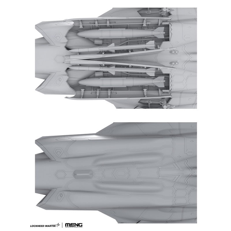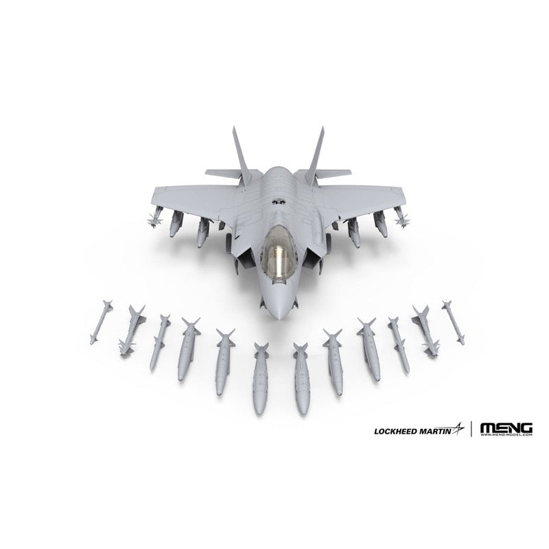 Meng's newest model kit of the F-35I Adir includes photo-etched parts, painting masks (for two Israeli Air Force specifications), and weapons: AIM-9X, AIM-120C, AMRAAM air-to-air missile, GBU-31-V1 guided bomb, SPICE-1000 guided bomb, and Python 5 air-to-air missile.