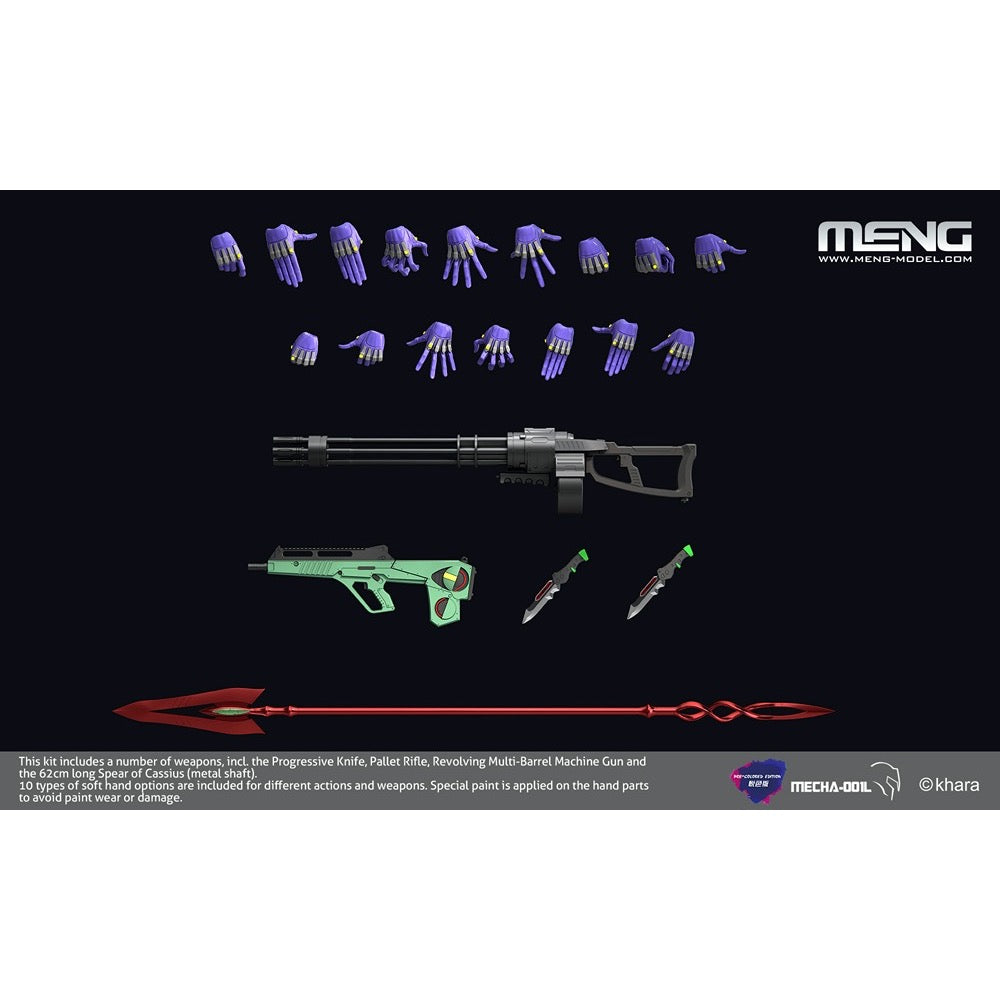 This MENG MECHA-001L Multipurpose Humanoid Decisive Weapon, Artificial Human Evangelion Unit-01 is a large scale pre-painted model kit. This pre-colored edition kit features cement-free assembly and pre-painted parts. The movable joints made of one-piece molding technology improve the stability and reliability of the Evangelion Unit-01 model. The joints are super movable. The Evangelion Unit-01 can be posed in the classic gestures and actions. This kit includes carefully designed lighting components: continuous lights for eyes and breathing light for the chest core. The lights are turned on/off by the installation of the Entry Plug. This kit includes a number of weapons, incl. the Progressive Knife, Pallet Rifle, Revolving Multi-Barrel Machine Gun and the 62cm long Spear of Cassius (metal shaft). 10 types of soft hand options are included for different actions and weapons. Special paint is applied on the hand parts to avoid paint wear or damage. This kit also includes fine decals.