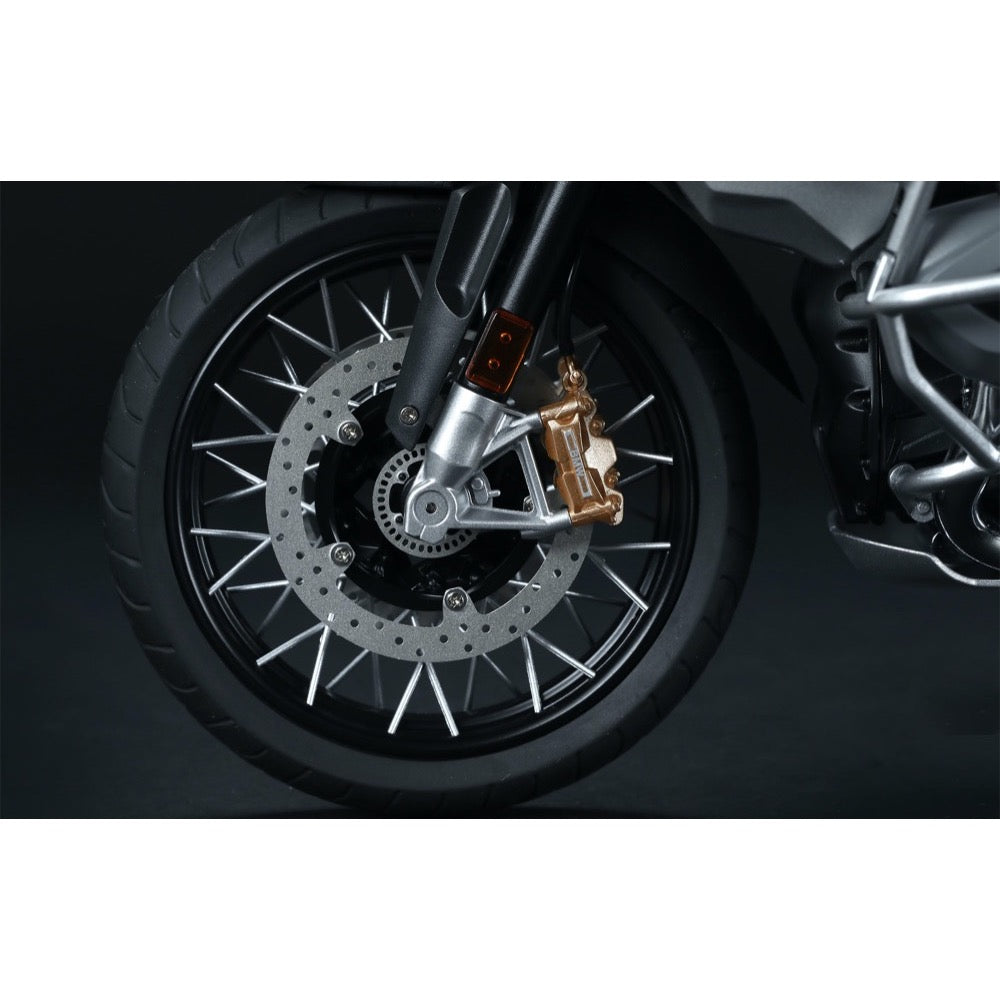 MT-005s BMW R 1250 GS ADV "Waterbird" off-road touring motorcycle is a 1/9 scale Yuese version assembled model kit jointly launched by MENG and BMW. After the kit is assembled, the car will be 253.3 mm long, 105.6 mm wide and 158.4 mm high. The Yuese version of the assembled model adopts a glue-free pre-painted design, which requires only assembly and no spraying. All car parts are beautifully pre-colored, with full texture and realistic effects. The model exquisitely restores the horizontally opposed "boxer" twin-cylinder engine and wonderfully interprets the classic load-bearing steel tube frame. The model's front and rear shock absorbers and directional dampers are all movable. The kit includes soft rubber seats and stainless steel brake discs.