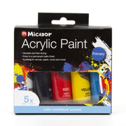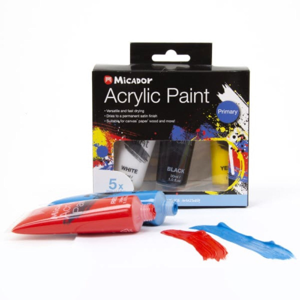 Micador Acrylic Primary Paint Set contains the five basic colours required to create a comprehensive colour palette. Blend the 30ml tubes of white, black, red, yellow and blue paint together for your favourite shades or apply the paint directly to your surface using a palette knife for interesting impasto effects.Micador Acrylic Primary Paint Set contains the five basic colours required to create a comprehensive colour palette. Blend the 30ml tubes of white, black, red, yellow and blue paint together for your favourite shades or apply the paint directly to your surface using a palette knife for interesting impasto effects.