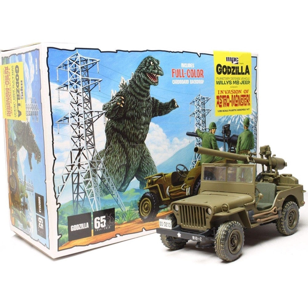 In addition to the Planetary Defense Vehicle Willys MB Jeep, this fun sci-fi kit also includes a full-color cardboard backdrop featuring Godzilla that measures about 10" tall. The kit also features many authentically detailed optional military and civilian parts, and you can choose to build either the military version or surrey version.
