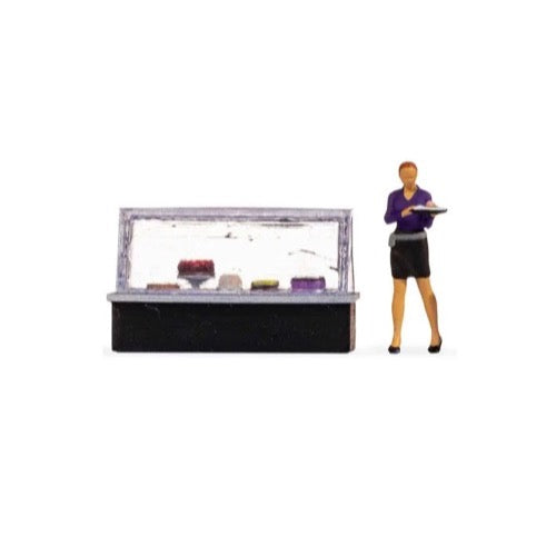 With the tiny scenes you can create a realistic market on your model landscape. Included in this scene is a black and silver cake stand. The five different cakes are lovingly placed on the sales floor. A female model figure is also included. She is wearing a black skirt and a purple blouse and is holding a tray with a piece of cake in her hands.