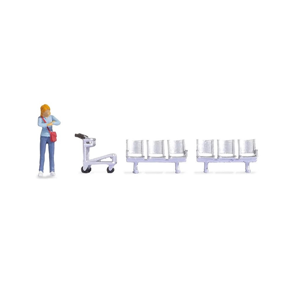 In this scene, a female traveller is looking at her wristwatch. She is wearing a light blue top and dark blue trousers. She also has a red bag on her shoulder. You also receive two matching benches for railway stations and a luggage trolley.