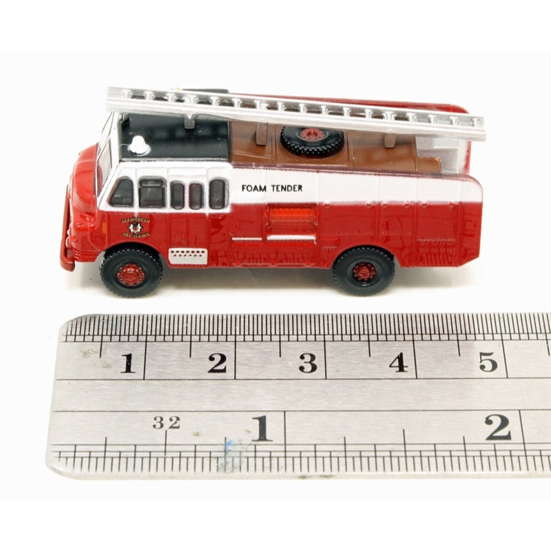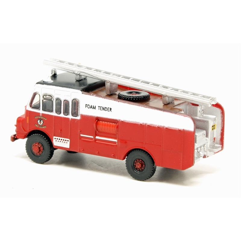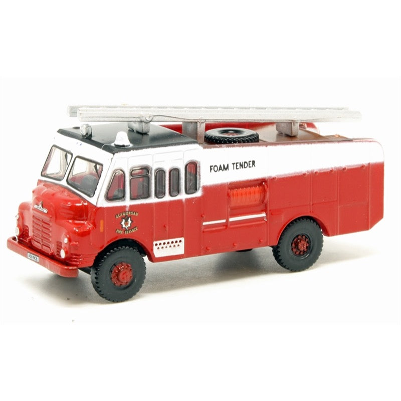 It features a white cab with a black roof, brown body roof which houses the single silver ladder, a white emergency belt, blue beacon, silver spotlight and the red hubbed spare wheel. The upper half of the body is masked white with black FOAM TENDER lettering along the sides. The red cab features the colourful Glamorgan Fire Service crest on both the doors while the vehicle rear is masked silver,