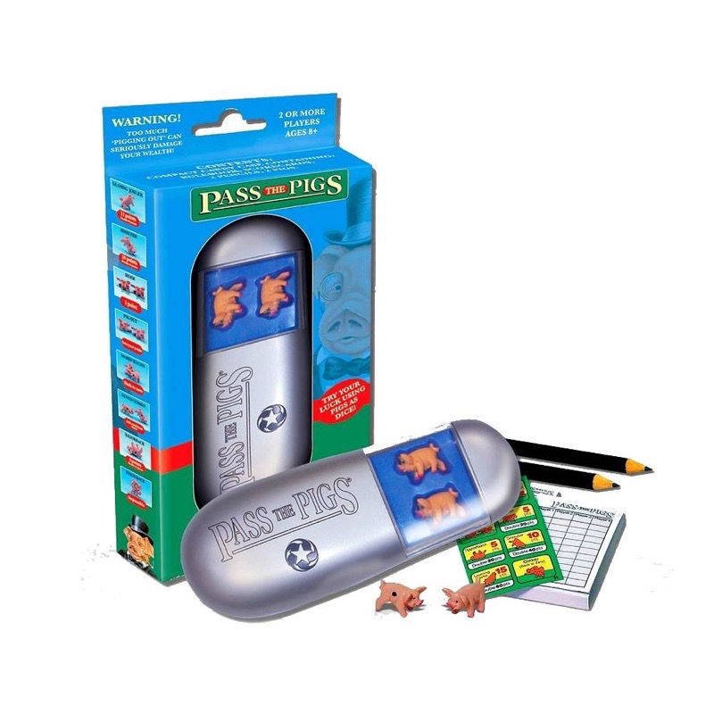 These 2 little pigs will keep you entertained all day long. This Pass the Pigs classic party game consists of 2 pigs you use as dice, pad, 2 pencils and carrying case. Roll them as many times as you dare on your turn to score points. Just don't role a "pig out" or an "oinker". First person to 100 points wins. Makes an ideal travel game with its small plastic carrying case.