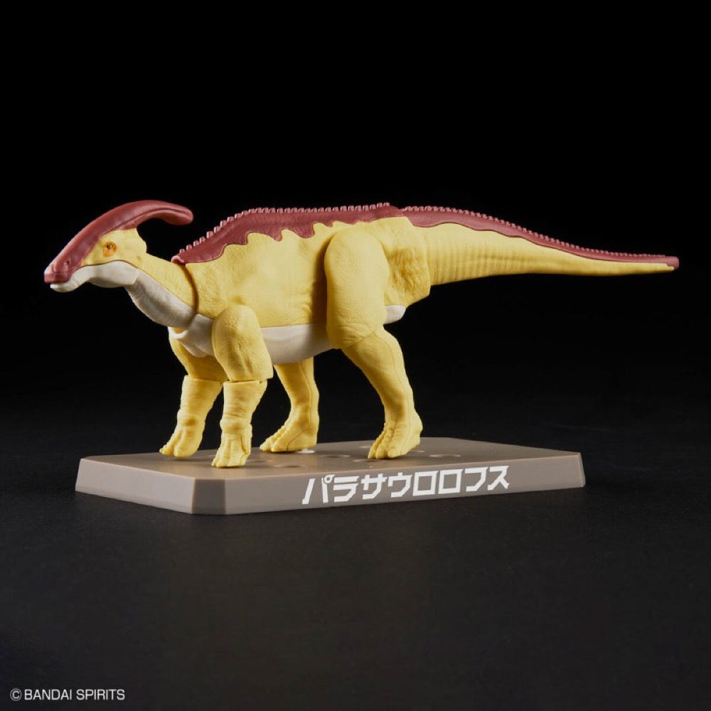 This model kit of the Parasaurolophus, with its distinctive crest, allows you to build either a male or female version with different selectable crests. The long, flat tail that balances the body on land and functions as a propeller when swimming is reproduced in detail; the large, uniquely shaped pelvic bone is also realistically expressed. Based on research on fossils of closely related species, it's believed that this species had mane-like scales on its back, similar to those of iguanas, and these are also included. The forelimbs, hind limbs, neck and tail of this kit will also be movable when completed, so you can display it in your favorite pose; a display base is included too.