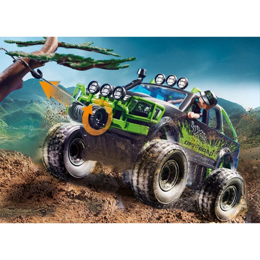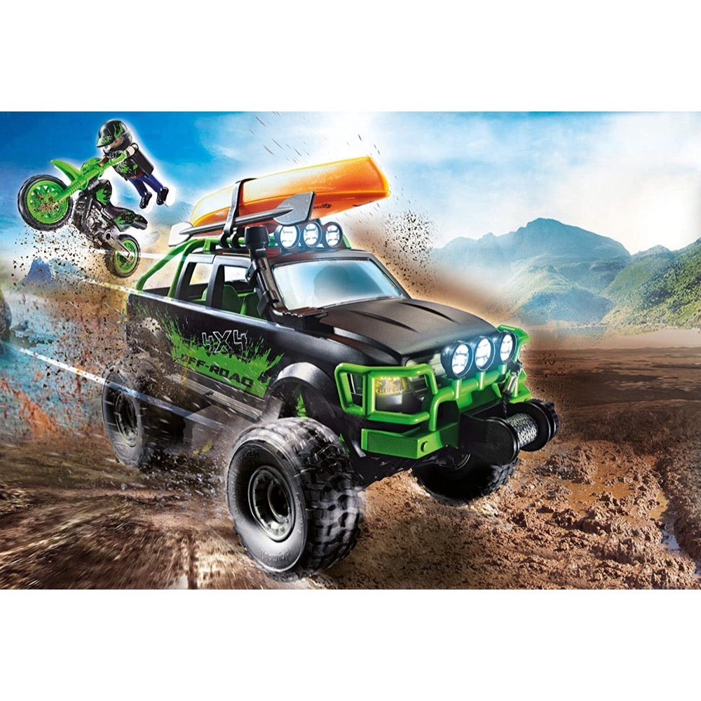Set includes one figure, 4x4 off-road vehicle, motorbike, canoe, and other accessories