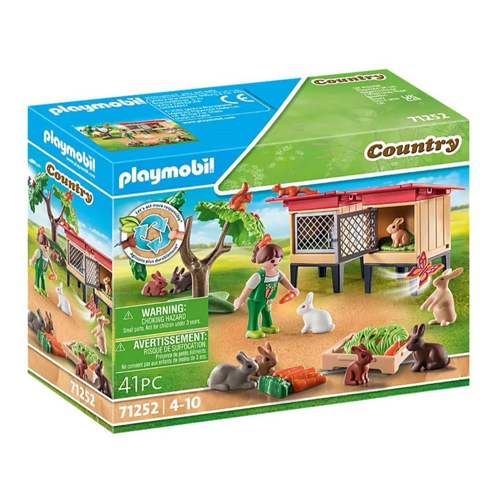 • • The 41-piece toy set includes a PLAYMOBIL child figure, a rabbit hutch, nine rabbits, two squirrels, a pigeon, green fodder, carrots and other lovely extras.