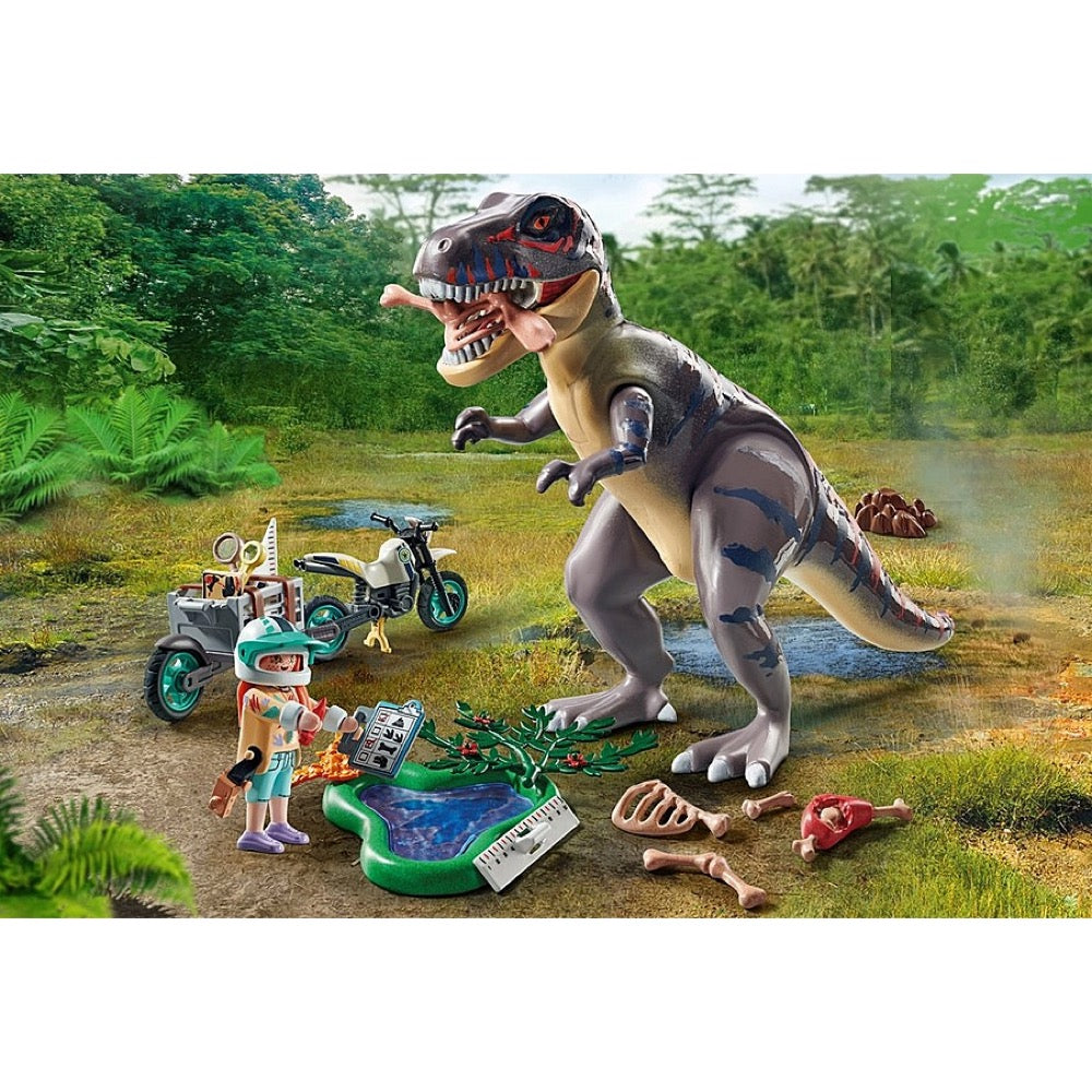 • Cool PLAYMOBIL Dinosaur set featuring a PLAYMOBIL researcher, a Tyrannosaurus Rex, a motorcycle with trailer, a puddle with a footprint, a magnifying glass, camera, map, and additional research equipment.