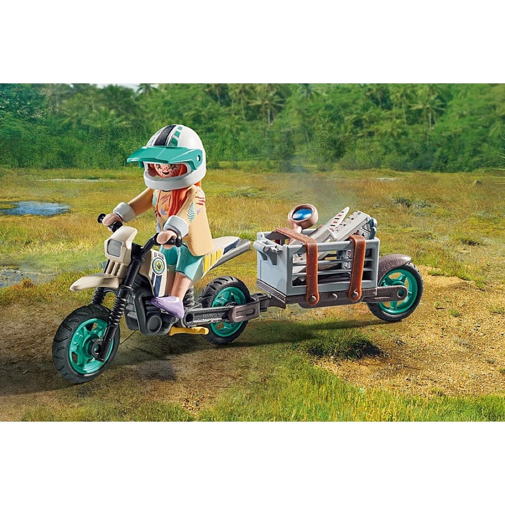 Experience extra-large dino fun with the T-Rex from PLAYMOBIL. On her motorcycle with trailer, the researcher embarks on a quest to uncover traces of the Tyrannosaurus Rex. She succeeds and soon discovers bone fragments and a gigantic footprint. But when the original T-Rex suddenly appears before her, it's time to stay calm. The PLAYMOBIL Dinosaur World invites kids aged 4 and up to immerse themselves in exciting role-playing adventures and relive the fascination of these giant reptiles at home.