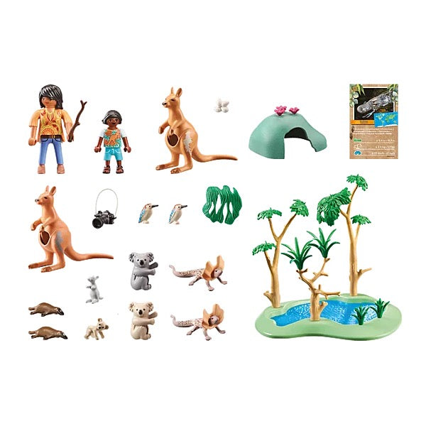 Figures: 1x woman with camera, 1x girl (Sofie Palmer) Animals: 2x platypus, 2x ruffed lizard, 2x kingfisher, 2x koala, 1x koala baby, 2x kangaroo, 1x kangaroo baby Accessories: 1x waterhole, 1x shelter, 3x trees, 2x grasses, 3x flowers, 1x nest with eggs