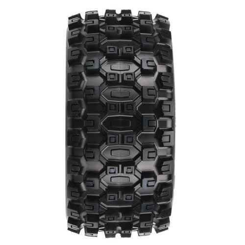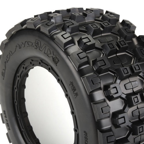 This is a pair of Badlands MX43 Pro-Loc tires. Pro-Line is ready to unleash the long-awaited tire solution for X-MAXX® owners with the Biggest and Baddest tire ever conceived: the Badlands MX43! Pro-Line Badlands tires are known for having a sweet Motocross inspired tread and the all-new Badlands MX43 tires kick that up a notch with a Bigger and Bolder knobby tread that matches modern MX tire design. These tires have been developed from the ground up for extreme X-MAXX® punishment with an all-new ultra-durable compound that prevents tire ballooning even at high speeds. The Badlands MX43 features Pro-Line's groundbreaking proprietary Pro-Loc Technology that creates an ultra-secure bond to Pro-Line's Impulse Pro-Loc X-MAXX® wheels while still being removable when required. The reinforced Tire bead fits into a uniquely shaped channel on the wheel and the bead-loc screws actually pass through the tire rubber before being pinched by the outer bead-loc ring to create the maximum possible mounting security. The Badlands MX43 is a true All-Terrain tire that will find traction on any surface but is best suited for loose & loamy dirt, mud or grass. Just imagine your X-MAXX® throwing up huge rooster tails with these aggressive looking tires!