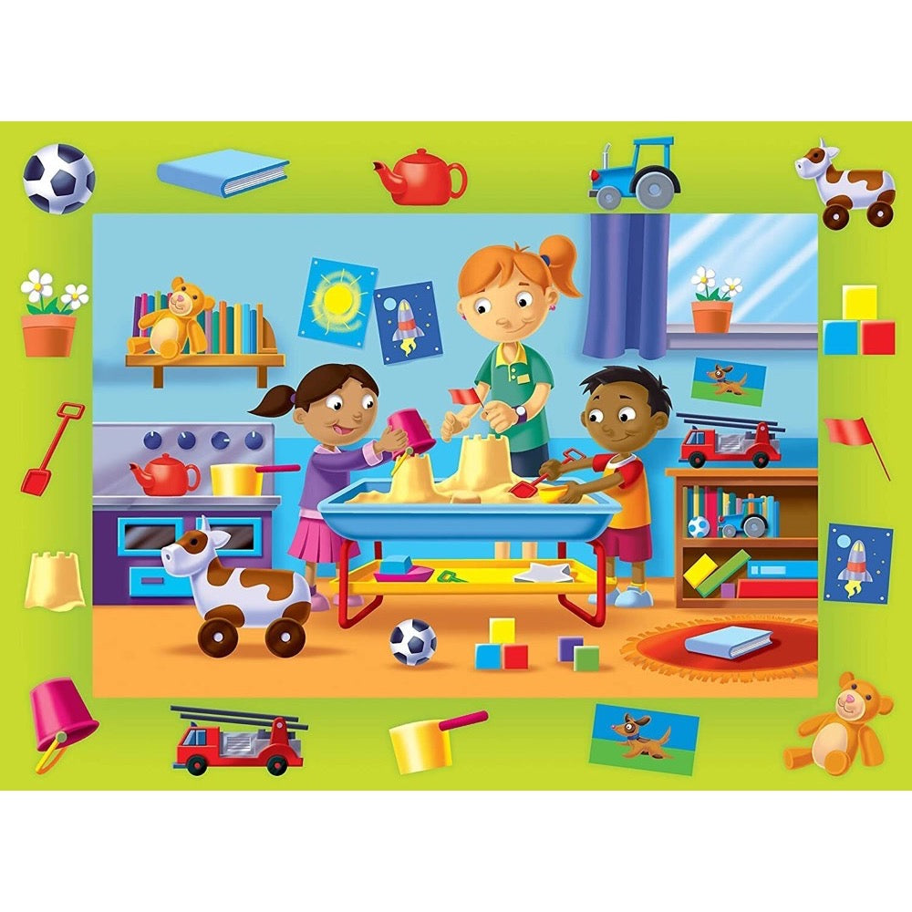 This bright and cheerful look and find puzzle shows 2 young children enjoying a fun day at playgroup or nursery, helped and guided by the nursery teacher. It's time for sand play, but there are many other toys to be enjoyed too including building blocks, a fab play kitchen, a push along fire engine and tractor, bouncy balls, books and soft toys. The main puzzle scene is surrounded with a border showing items children can find within the main scene, helping them to build observation and object identification skills. And the box base includes a fun learning guide offering ideas on how to use and enjoy this puzzle with your family. This specially created design has been inspired by the Early Years Foundation Stage guidelines, and will support and develop a child's understanding of their own lives and families.