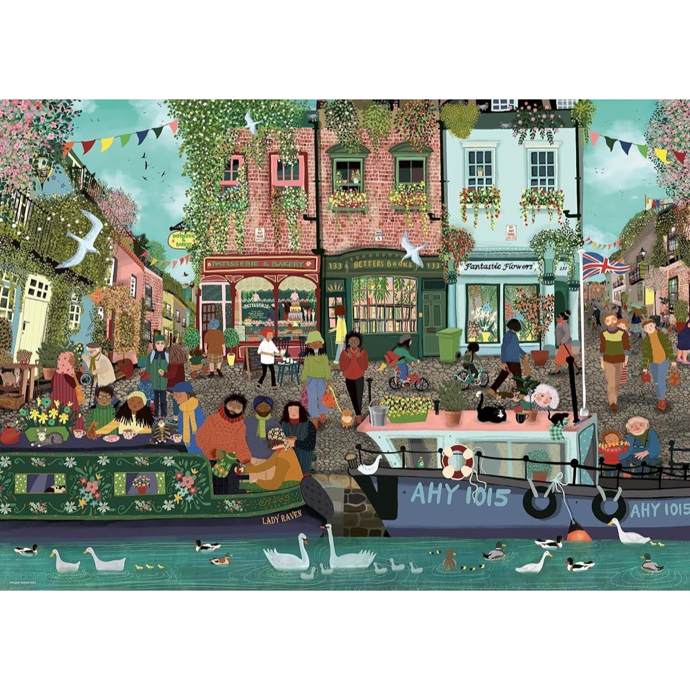 Walking down the cobbled lanes, the locals and visitors alike enjoy meeting and making friends beside the colourful narrowboats. Like-minded boat owners share cups of tea whilst their contented cats bask in the Spring sunshine and the tiny ducklings take their first paddle. The patisserie, florist and bookshop are open for business with their pretty window boxes in full bloom. What a delightful way to enjoy the nomadic freedom of river life, aboard a bohemian narrowboat! So relax as you piece together this bright and vibrant Riverside town 1000 piece jigsaw puzzle.