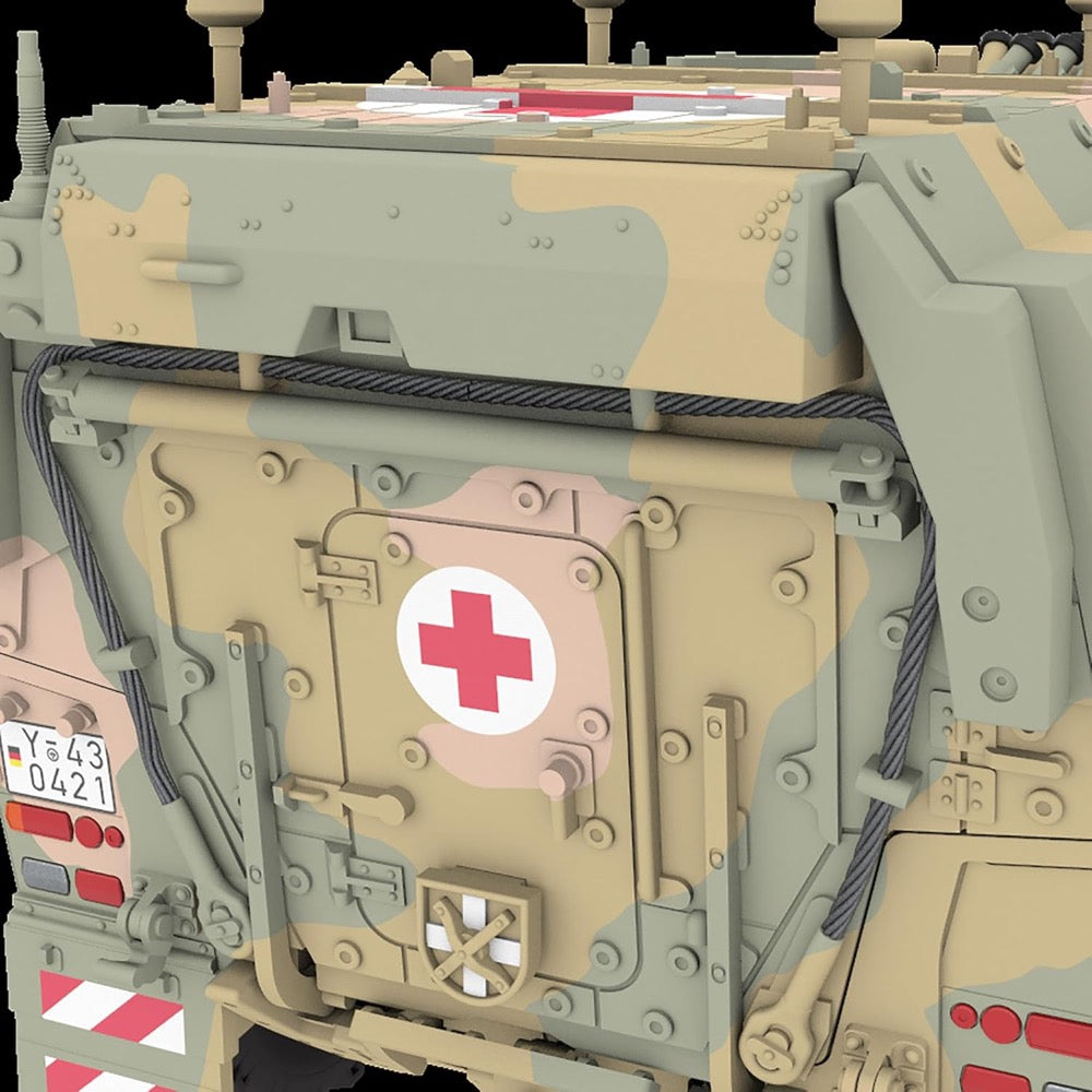 The model impresses with its authentic detailing and allows you to build a replica of one of the most modern medical vehicles in the German Armed Forces. The modular design of the original has been precisely implemented and offers exciting insights into the innovative technology of the vehicle.